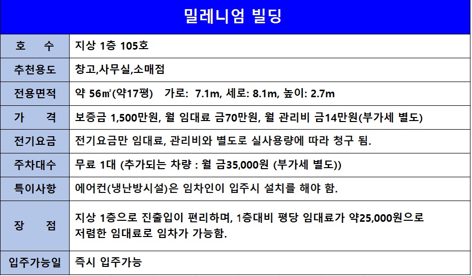 밀레니엄빌딩은 최근 화장실, 엘리베이터, 배관, 주차장 등 공용구간을 리모델링 공사 진행하였으며, 평당 임대료가 약 25,000원으로 월세에 대한 큰 부담이 없고, 목감사거리 인근 위치하여 내방객의 출입이 매우 용이한 점이 가장 큰 장점입니다.