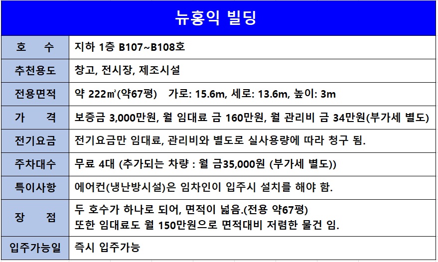 | 뉴홍익빌딩은 건물 전체가 유한책임회사 뉴홍익 단독소유로 호실별로 소유자가 다르지 않아 체계적인 관리가 되고 있고, 사용용도에 따라 면적이 다양하게 임대가 가능합니다. 뉴홍익빌딩은 수인산업도로변에 있는 앞마당이 넓은 건물로 약160대의 넓은 주차공간이 있어 차량의 진출입이 편리하고 가시성이 뛰어납니다. 또한, 엘리베이터 총3대(인승용 2대,화물용 1대)를 확보하여, 입주자분들이 불편없이 건물을 이용할 수 있게 하였습니다. 지상층의 경우 층고가 약3.3m로 높은 장점이 있고, 상대적으로 저렴한 임대료로 답답하지 않은 넓은 공간에서 안정적인 사업을 하고자 하는 임차인분에게 추천하는 건물입니다. |