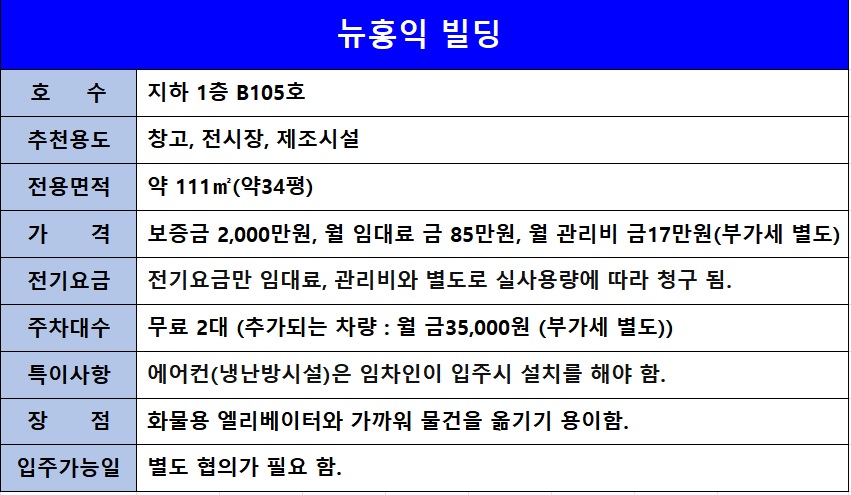 | 뉴홍익빌딩은 건물 전체가 유한책임회사 뉴홍익 단독소유로 호실별로 소유자가 다르지 않아 체계적인 관리가 되고 있고, 사용용도에 따라 면적이 다양하게 임대가 가능합니다. 뉴홍익빌딩은 수인산업도로변에 있는 앞마당이 넓은 건물로 약160대의 넓은 주차공간이 있어 차량의 진출입이 편리하고 가시성이 뛰어납니다. 또한, 엘리베이터 총3대(인승용 2대,화물용 1대)를 확보하여, 입주자분들이 불편없이 건물을 이용할 수 있게 하였습니다. 지상층의 경우 층고가 약3.3m로 높은 장점이 있고, 상대적으로 저렴한 임대료로 답답하지 않은 넓은 공간에서 안정적인 사업을 하고자 하는 임차인분에게 추천하는 건물입니다. |