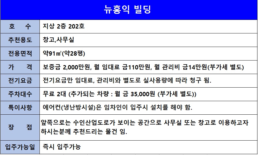 | 뉴홍익빌딩은 건물 전체가 유한책임회사 뉴홍익 단독소유로 호실별로 소유자가 다르지 않아 체계적인 관리가 되고 있고, 사용용도에 따라 면적이 다양하게 임대가 가능합니다. 뉴홍익빌딩은 수인산업도로변에 있는 앞마당이 넓은 건물로 약160대의 넓은 주차공간이 있어 차량의 진출입이 편리하고 가시성이 뛰어납니다. 또한, 엘리베이터 총3대(인승용 2대,화물용 1대)를 확보하여, 입주자분들이 불편없이 건물을 이용할 수 있게 하였습니다. 지상층의 경우 층고가 약3.3m로 높은 장점이 있고, 상대적으로 저렴한 임대료로 답답하지 않은 넓은 공간에서 안정적인 사업을 하고자 하는 임차인분에게 추천하는 건물입니다. |