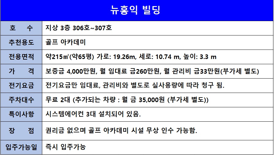 | 2층 | 골프연습장 | 운동시설(골프연습장) | 309.09㎡ 93.5평 |