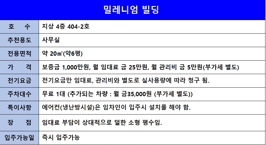 밀레니엄빌딩은 최근 화장실, 엘리베이터, 배관, 주차장 등 공용구간을 리모델링 공사 진행하였으며, 평당 임대료가 약 25,000원으로 월세에 대한 큰 부담이 없고, 목감사거리 인근 위치하여 내방객의 출입이 매우 용이한 점이 가장 큰 장점입니다.