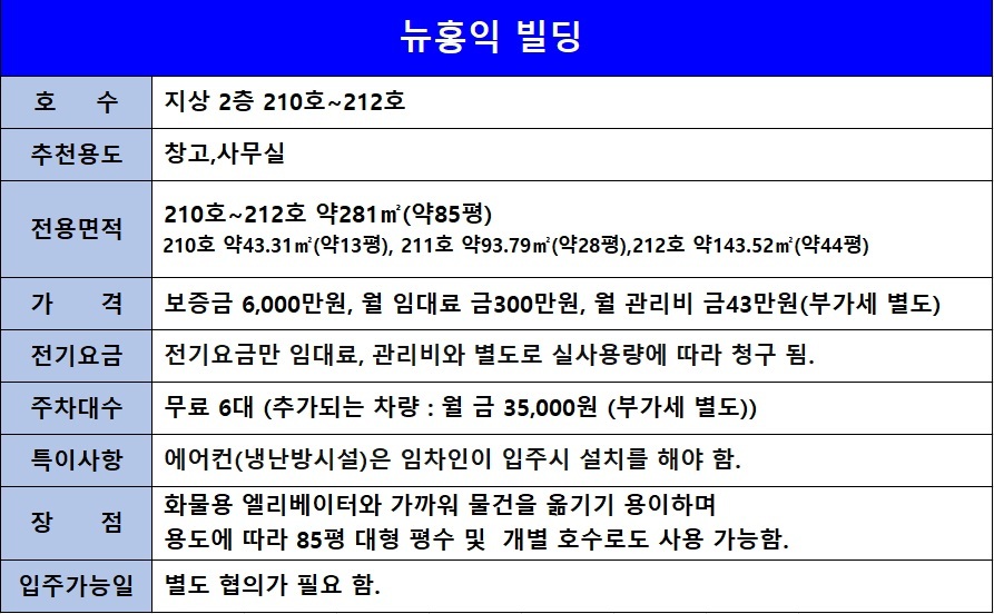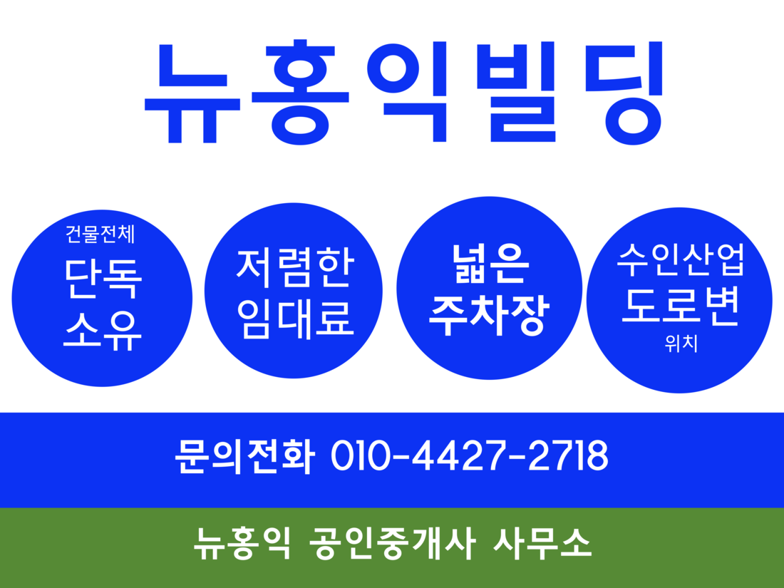 | 뉴홍익빌딩은 건물 전체가 유한책임회사 뉴홍익 단독소유로 호실별로 소유자가 다르지 않아 체계적인 관리가 되고 있고, 사용용도에 따라 면적이 다양하게 임대가 가능합니다. 뉴홍익빌딩은 수인산업도로변에 있는 앞마당이 넓은 건물로 약160대의 넓은 주차공간이 있어 차량의 진출입이 편리하고 가시성이 뛰어납니다. 또한, 엘리베이터 총3대(인승용 2대,화물용 1대)를 확보하여, 입주자분들이 불편없이 건물을 이용할 수 있게 하였습니다. 지상층의 경우 층고가 약3.3m로 높은 장점이 있고, 상대적으로 저렴한 임대료로 답답하지 않은 넓은 공간에서 안정적인 사업을 하고자 하는 임차인분에게 추천하는 건물입니다. |